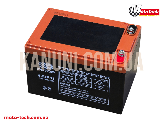 Акумулятор OUTDO 6-DZF-13 (12V13Ah/2HR) - є перезаряджуваним тяговим свинцево-кислотним акумулятором (VRLA) типу AGM/гель-подібного виконання, призначеним для застосування в електротранспорті. Тягова серія (DZF): Оптимізований для частих циклів "заряд-розряд", що робить його ідеальним вибором для електровелосипедів, скутерів, дитячих електромобілів та інвалідних візків. Полярність: «+» зліва / «–» справа (D1 термінал). Напруга: 12 В, 13 А·год (2-годинний режим). Розміри: Д: 150мм Ш: 101мм В: 99мм. Вага: 4,15 кг. Кількість в ящику: 4 од. |
